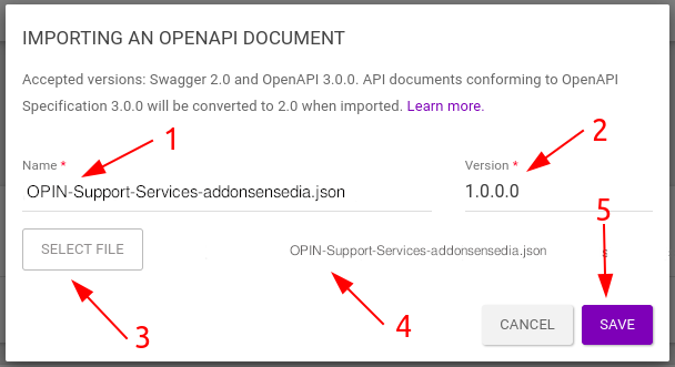 3. In the modal window, click [ SELECT FILE ] and select the file OPIN-Support-Services-addonsensedia.json to import it.